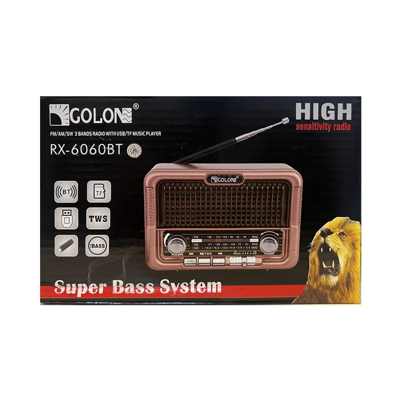 کمپانی GOLON یکی از معروفترین شرکتهای تولیدکننده رادیو و اسپیکر در دنیا است. رادیو گولون مدل RX-BT6060S یکی از محصولات جدید این شرکت است. این رادیو قابلیت دریافت امواج رادیویی FM در بازه 88 الی 108 مگاهرتز، موج AM در بازه فرکانسی 530 تا 1710 کیلوهرتز، موج SW در بازه فرکانسی 5٫9 الی 18 مگاهرتز را دارد. همچنین این دستگاه قابلیت پخش موسیقی از طریق حافظه USB، کارت حافظه microSD و بلوتوث طراحیشده است و کیفیت صدای بالایی دارد. تامین انرژی رادیو اسپیکر Golon RX-BT6060S از طریق باتری لیتیومی مدل 18650 قابل شارژ با ظرفیت 2200 میلی آمپر و همچنین پنل خورشیدی در قسمت بالای دستگاه صورت می گیرد طراحی کلاسیک بدنه با استفاده از پلاستیک مرغوب با طرح چوب صورت گرفته است؛ برخورداری از آنتن جمع شونده با قابلیت تنظیم میزان ارتفاع تا 30 سانتی متر از دیگر ویژگی های این محصول است. کلیدهای کنترلی به منظور مدیریت موزیک در حال پخش، تنظیم امواج رادیویی، تنظیم صدا بر روی پنل جلویی دستگاه تعبیه شده اند. در سمت چپ دستگاه علاوه بر کلید تنظیم حالت پخش، درگاه کارت حافظه USB، درگاه حافظه microSD و چراغ شارژ تعبیه شده است. همراه محصول سیم شارژ microUSB، بند و باتری لیتیومی 18650 ارسال می شود.